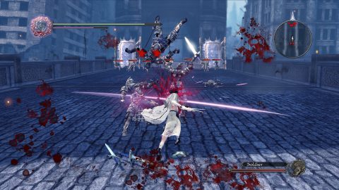 Like the other two in the series, the game plays like Koei-Tecmo’s Musou series. Zero has 4 types of weapons, able to switch at them on the fly in battle to keep her combo going, and each one has a unique feel. Stronger weapons of each type are found in chests during the game or in the store between missions, and each one can be upgraded with the right item and amount of gold. When the rose in the upper left of the screen fills up enough, she can activate Intoner mode, allowing her to go berserk on enemies. She also has defensive options, blocking, dodging, and parrying. A stamina meter regulates these moves, as well as her more powerful strikes. These mechanics work, but they lack polish. The camera is wonky, easily confused near a wall, and the lock on mechanic doesn’t help either, homing in on a far away enemy instead of closer ones or cropping Zero off screen when locked on to a tall enemy. She’s also too easily interrupted in the middle of a combo. Long range enemies like archers can stop her in her tracks with a succession of arrows, leaving her open to attack. It leads to Zero feeling both strong and weak simultaneously. She can cut through scores of soldiers and splatter their blood across the screen, but the right mix of foes can sap her health seemingly at any moment.
