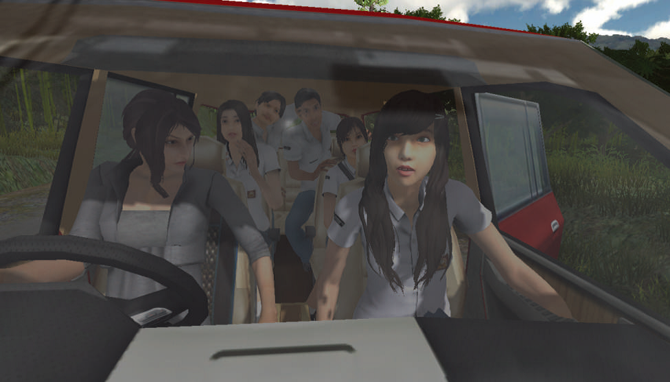 DreadOut is deeply inspired by the Fatal Frame series, in which young girls armed with nothing but an old magic camera make their way through haunted traditional Japanese environments. Therefore, it’s of no surprise that the protagonist Linda is a high school girl who is also equipped with a camera. But while Fatal Frame is one of the most consistently dark and ghastly horror games around, DreadOut breathes Southeast Asian spooky kitsch. So Linda doesn’t carry an ancient and potentially magical camera, but simply uses the cam function on her smartphone. That’s also why the story begins with as many horror movie clichés as could be crammed into the first five minutes of a game. Linda and a handful of her schoolmates are on the road with their teacher Miss Siska to some unexplained school trip, when they take a wrong turn and happen upon a broken-down bridge. The kids are eager to find a way around it and reach a completely abandoned village. The place is creepy enough in daylight, but as the students dawdle around in the derelict school building, night falls and they find themselves surrounded by almost everything evil found in Indonesian folklore, led by a mysterious lady in red.