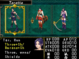 In the DS version, there are three races – Oros, Taratta and Emporos – each with three classes: hunter, for ranged attacks; warrior, for close range attacks; and magician, for concentration in spells, making for a total of nine characters. Each has a different weapon – the Oros warrior wields a bow and arrow, while the Emporos warrior uses pistols and shotguns. However, most of the characters wield melee weapons, as opposed to the projectiles from the previous game. Visually, though, they almost all look identical, outside of their coloring. The terrain consists of smudgy 3D graphics – typical for the DS – with ugly looking sprites.
