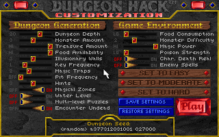 Character creation is standard fare. You’re given a variety of races and classes to choose from, and can edit your stats manually or allow them to be randomly generated. Since there is only one character in your party at all times, classes have been created to cover a larger basis such as the Fighter/Cleric/Mage. Once your character has been created you’re then given the option to select between four difficulties; Easy, Moderate, Hard, and Custom. This is where much of Dungeon Hack‘s diversity comes from, and ultimately allows the player to control various aspects of the game before beginning.