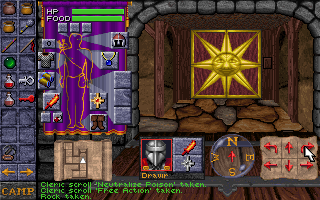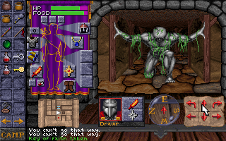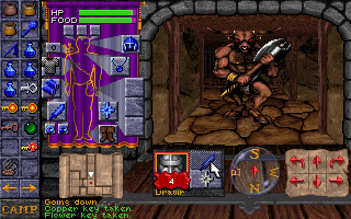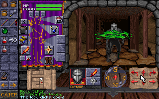 The overall presentation, once you begin the game, is the same as in Eye of the Beholder. You navigate the dungeon from a first-person perspective, and enemies roam freely while engaging in combat once they’re in range to attack. The combat is where Dungeon Hack differs from traditional roguelikes. Whereas in Rogue all actions and attacks took place in a turn-based environment, Dungeon Hack remains more of a real-time experience.