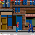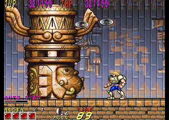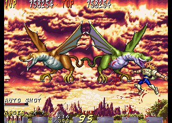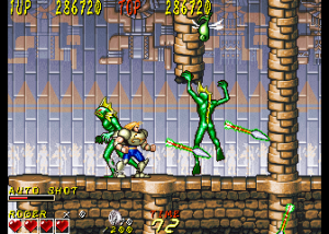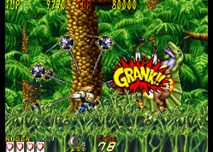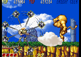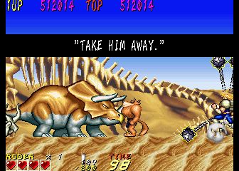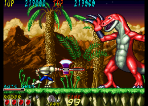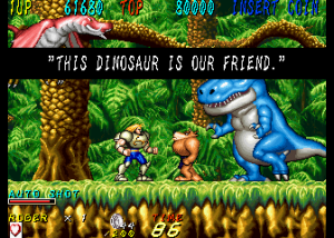Dyna Gear is a co-op arcade run-and-gun, with a heavy emphasis on the “run” part. The game is almost always in forward motion as the heroes, Roger and Wolf, slice up evil dinosaurs and whatever other troubles they happen upon. There are lots of hills and slopes, walls to climb and branches to grapple under; it’s like that one section in Strider where you careen down an exploding hill, extrapolated out into an entire game. Roger is slightly faster while Wolf jumps higher, though they still play similarly. The title is actually quite clever too – the “Dyna” part suggests explosives like “dynamite” while also sounding like the first half of the word “dinosaur”. The title screen also charmingly refers to itself as “An Action Adventure On The Era Of Dinosaur”.