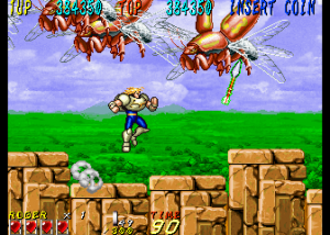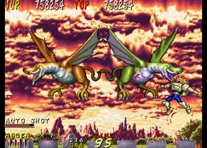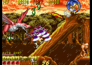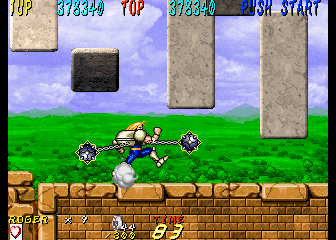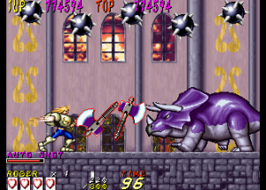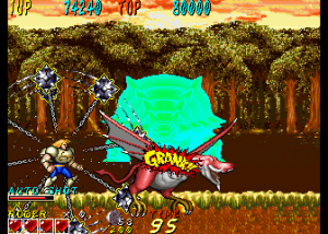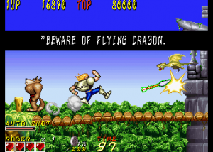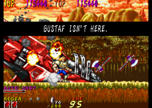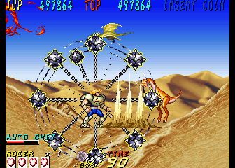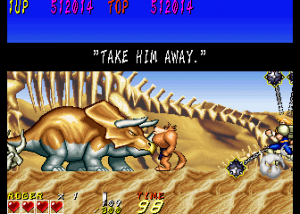 Dyna Gear is one of those many mid-90s arcade games that just disappeared in smoke, especially having never been ported to a console, but its madcap liveliness and goofy sensibilities turn it into a good time. While the game is credited to Sammy, it was actually developed by Scarab, a company founded by Tsutomu Fujisawa in the wake of UPL’s bankruptcy. One of Fujisawa’s last games for UPL was Vandyke, an overhead action game that shares some elements with Dyna Gear, like the prehistoric enemies, the spinning ball-and-chain weapon, and its oddball sense of humor. However, they play very differently, so they can’t really be said to be related. Scarab then worked on a number of fighting games, including Sammy’s Survival Arts, as well as the dire 32-bit fighters Battle Monsters and Killing Zone. They did work with Sega on the All Japan Pro Wrestling series, including the Giant Gram games for the Dreamcast. In 2002 it was subsumed into Cavia, where it was later renamed feelplus. Eventually both entities merged with Artoon and all were absorbed into Marvelous.