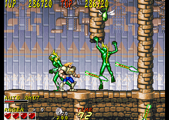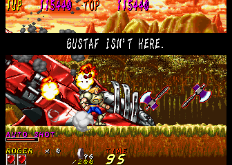 The only real sore spots come when the game loses its forward momentum. The fourth stage, the Labyrinth takes place in a trap-filled temple, which forces you to climb through narrow corridors and enclosed spaces while dodging spears in the walls, and it’s just not much fun. The boss and mini-boss fights similarly causes the pace to come to a halt; there’s nothing particularly bad about most of them and they’re resolved fairly quickly, so it’s generally not much of a problem…except the very last level has a boss rush against previously defeated baddies before facing off against Gustaf, which grows very tiresome. Most of the game isn’t hugely difficult before this point, as you get a life bar and a number of lives, though continuing sends you back to an earlier checkpoint. There are two endings, one where Wolf’s tribe are able to repair Roger’s ship and he’s able to return home, while in the other, Roger is stranded and needs to wait for a rescue vessel. It’s not entirely clear how these are triggered, but it seems to be based on which character was chosen and if they used continues or not.