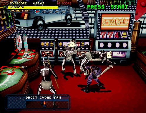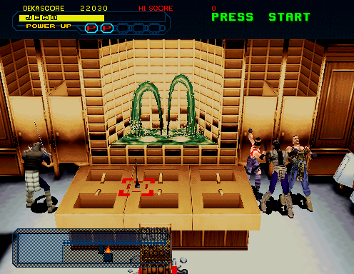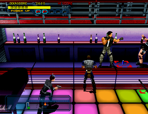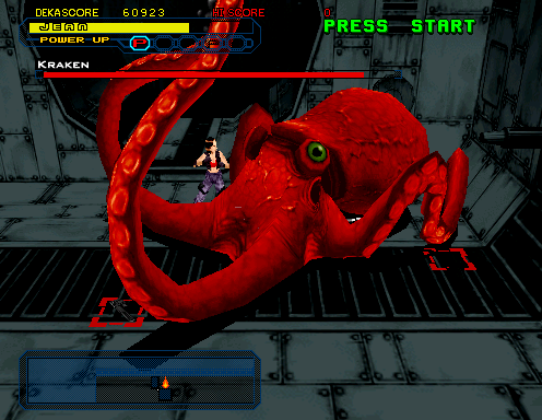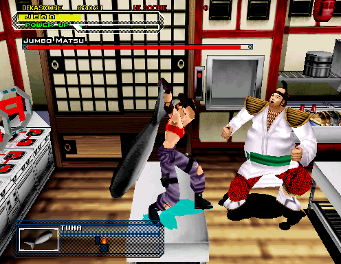 While the first game was fairly faithful to the style of American action movies with a bit of Japanese arcade-game silliness, Dynamite Cop takes everything much further and joyfully revels in absurdity. The rocket launchers and anti-tank rifles in the first game were fun, but this game has ship-to-ship missiles which blow up enemies with miniature mushrooms clouds. Even fairly innocuous objects like soda machines and arcade cabinets will explode upon impact when thrown. The game takes the theme of “modern day pirates” a little bit too literally, with most of the terrorists dressing like they stepped out of a theme park. In addition to the guys and gals dressed in garish neon ascots and ridiculous eye-patches, you’ll find people in shark outfits. Throughout the ship, you’ll fight enemies in a nightclub, in a casino, and a gym. You will fight a gigantic sushi chef while wielding an enormous tuna. At some point you will fight a gigantic octopus. The final battle is, again, a fist fight with Wolf Hongo, although this time he’s modified his body with cybernetic enhancements and can shoot lasers out of his eye. It’s the sort of thing that acts as both a loving emulation of action movies and a gloriously over-the-top parody.