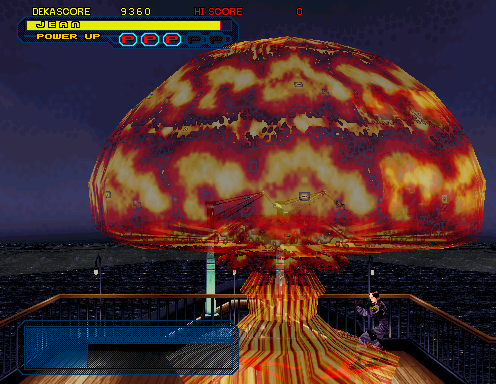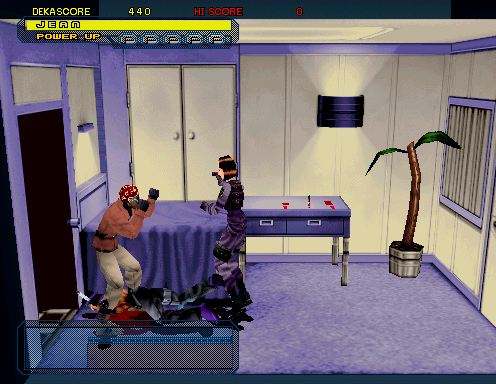 Dynamite Cop was ported to the Dreamcast, although the upgrade in hardware didn’t do much to the visuals other than displaying them in a slightly higher resolution. All of the cutscenes have been pre-rendered at a higher quality though. A few minor things have changed in these, like the president’s daughter now hiding in a bright pink suitcase rather than beneath a desk. Upon completing all of the standard courses, you can also unlock a second, more difficult set of missions. There are also a number of extra costumes for the characters.
