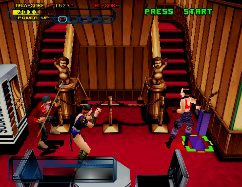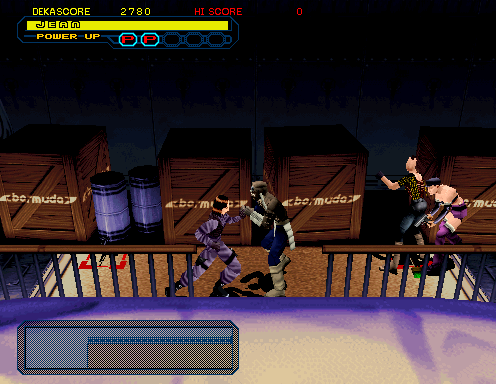 For the most part, the fighting work very similar to the original. You can now face and attack in all eight directions instead of just left and right, and there are a number of cool grappling suplex moves that are easy to pull off and immensely satisfying to watch (and listen to, given the exaggerated bone-breaking sound effects.) You can also pick up disabled enemies and use them to whack other bad guys, a bit like the Kunio games. In addition to the numerous weapons, there are also “P” icons, which will grant your character additional strength for a short amount of time when you collect enough of them. The game runs on the Model-2 engine, meaning a rather substantial visual upgrade compared to the original. Unlike the first game, this one was developed entirely in Japan, although the music is once again supplied by Howard Drossin.