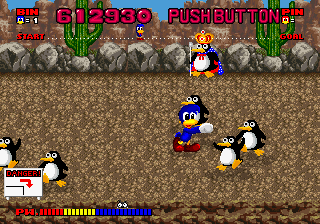 It’s all an impossibly colorful and silly game. Bin and Pin are bright blue and red, respectively. The major enemies are dogs with gigantic jaws that take up approximately 80% of their body mass. Also present are cross-eyed coyotes decked in army gear and manning artillery cannons, as well as rhinoceroses in American football uniforms. Also running around are penguins in the middle of a desert, displaying not only a total lack of understanding of American geography, but also climate zones.