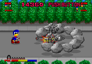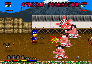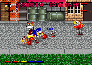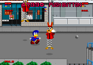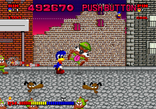 The mechanics are a bit different from typical beat-em-ups, in that most enemies perish after a single hit, and the game never stops and waits for you to clear the enemies before moving on. Most stages also have a branching path somewhere near the middle. Also, since the ducks have super-deformed proportions, their limbs barely have any reach, and combined with the occasionally erratic movements and attacks of the enemies, the hit detection feel rather dodgy. You have a super attack where you hold down the attack button to wind up your arm and deliver a knock-out uppercut, with a super-sized fist, although it too is slightly awkward to use. There are numerous weapons throughout each stage though, and nearly all of them fire projectiles, ranging from simple rocks all the way up to flamethrowers and bazookas.