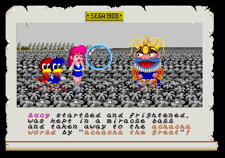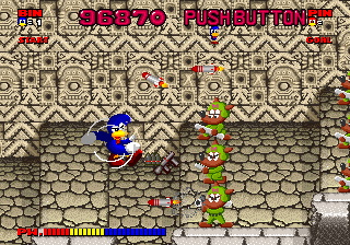 The “men fight to save kidnapped woman” theme is still present, although here, the men are actually pet ducks named Bin and Pin, who are trying to save their owner Lucy from the evil Achacha. The intro, where the ducks and the girl are playing around in a meadow before the main bad guy appears out of nowhere, was also borrowed for Alex Kidd in Shinobi World (where the question of who owns ducks as pets is never fully addressed). The stages are a hodgepodge of barely cohesive themes, starting off in a city, before warping to ancient Japan, a jungle, off to Brooklyn and Texas, and then to the final lair of Achacha, which is vaguely Egyptian.