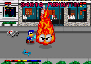 Colonel Sanders, he of Kentucky Fried Chicken, makes an appearance right at the beginning, and makes it his purpose to act as a referee in the boxing match bonus rounds. It’s a weird and wonderfully detailed game, meshing Warner Bros.-style slapstick with the randomness of Japanese humor, rendered in beautiful late-1980s pixel artwork. The only major disappointments are the bosses, which consist of generic things like rock monsters and gigantic flames, and are reused throughout.