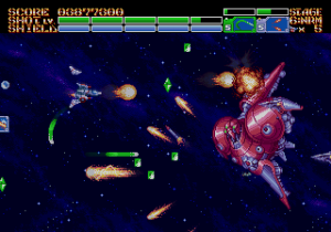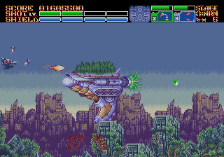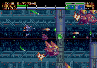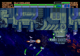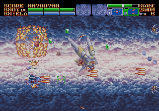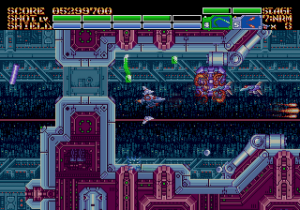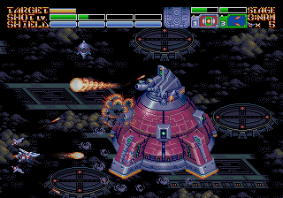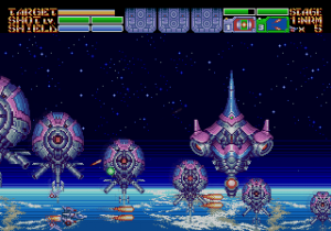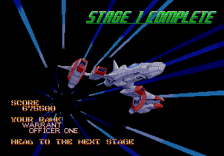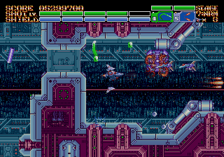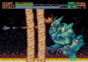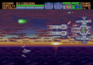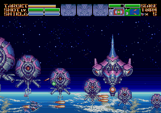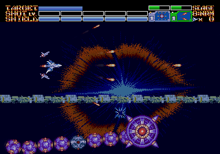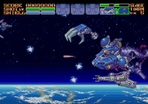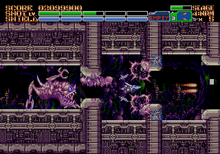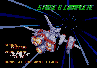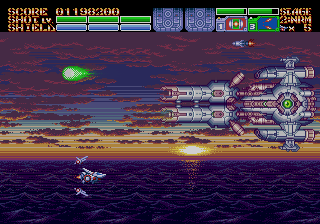 As expected from an Ancient title, the soundtrack is fantastic. Yuzo Koshiro isn’t just a brilliant video game music composer, but he’s a big VGM nerd in general, and he’s able to assemble a crunchy soundtrack that screams “shoot-em-up music”. Some of it channels Konami, particularly the distinct orchestral hits, with other compositions being more complex than typical 16-bit soundtracks. Most of the best songs are near the end, including as Gradius-as-hell song for the Gradius-as-hell penultimate stage, and a truly rocking heavy metal track for the final battle, which proudly stands up next to MUSHA and Thunder Force IV as one of the best showcases of the Genesis sound chip. Also hidden is the track called “Space Travel 2025”, based on an unused track composed for ActRaiser thirty-five years prior. (At the beginning of the sixth stage, hold down A+C+Start to change the music.)