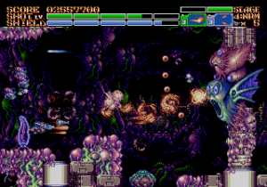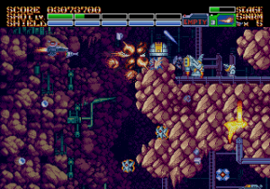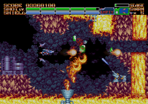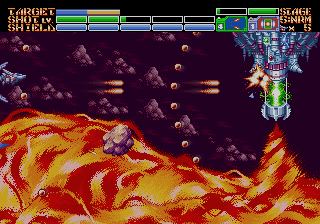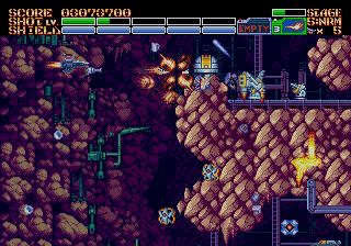 The fourth level begins with you being chased by an alien monstrosity through a tight series of tunnels, and you continue through the rest of it cleaning the level of Life Force-style biological goo. The fifth stage takes place underground, where you fight an enormous MECHA in a pool of lava, who attacks with gigantic claws and flame pillars. The final three stages are one long assault on the alien HQ, beginning as you fly around its exterior, zoom inside to the core for a Gradius-style base level, then back into outer space for a three-part final boss encounter. Each level also begins and ends with a lavish animation of Earthion smoothly blasting into the gameplay field or out into the victory screen. It’s really showing off that 60 megabit of ROM space, which is several times larger than any Genesis shoot-em-up from the 1990s.