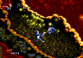 Earthworm Jim was initially released on the Genesis and Super Nintendo. The Super Nintendo version has generally has better graphics, with more defined colors and lots of extra special effects, and nearly all of the stages have an extra level of background scrolling. However, due to the system’s lower resolution, the screen view is slightly smaller, and everything is slightly fatter when viewed on a CRT television screen. The Genesis version isn’t quite as nice, as the backgrounds have a dithered look to them, but it still looks pretty excellent, plus it has one extra stage, Intestinal Distress. The explanation behind this was that the Genesis version was more easily compressed and had the room for the bonus level. Both versions also have different sound synth, and while the SNES version has better (and in some cases, different) digitized samples, the difference in the soundtrack is more a matter of taste.