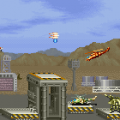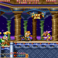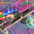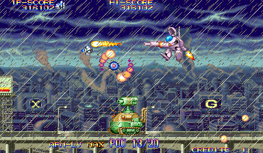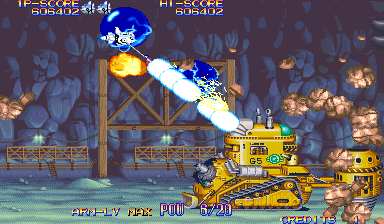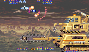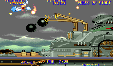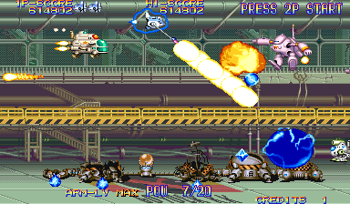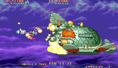 There are four types of weapons associated with the arm: the default energy shot, the hammer, the laser sword, and the foil scatter bomb. Each has five levels of power, which increased by one when you grab twenty power-up icons, or by obtaining the same weapon pick-up again. The hammer is the most fun of these, as it acts sort of like a large yoyo that can be used to pummel bad guys, but the laser sword is fun too, because the rate of fire is so high, you can press one of the rotational buttons and send a constant stream of beams all around the screen.. They’re downgraded whenever you die, but it’s also heavily upgraded when you run out of lives and use a continue. The arm weapons have charge attacks, though unlike other shoot-em-ups, you don’t need to stop firing to juice them up. Instead, they’ll gain strength even when you’re firing, and are unleashed whenever you lay off the trigger button. This allows for a constant if fluctuating pace of fire, making you feel more powerful than most other shooters with similar mechanics. There are also three subweapons shot out by the main ship: a rapid fire Vulcan cannon, a bomb, and a homing shot. These are less common than the arm upgrades, and can’t be upgraded in strength.