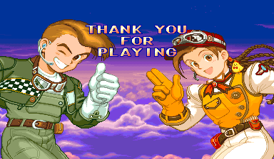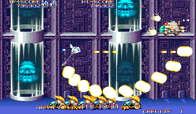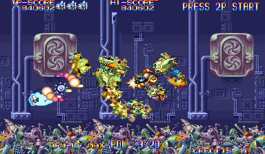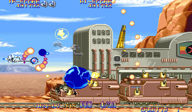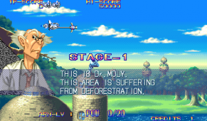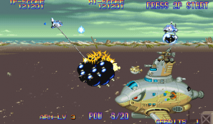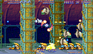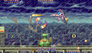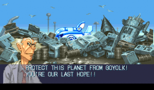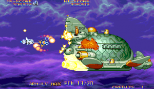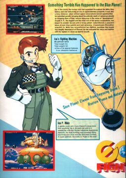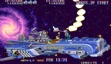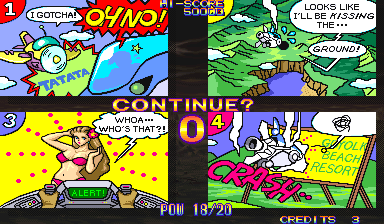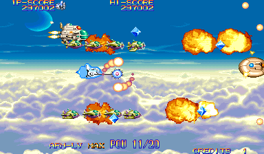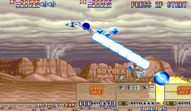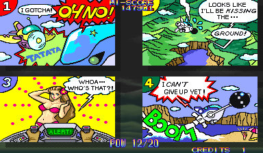 At the beginning of each mission, Dr. Moly gives a briefing of the level and how it’s being affected. These scenes are fully voiced (though left in Japanese even in the English version), impressive for a mid-90s arcade game. Kernel Goyolk, has all of the hallmarks of an egocentric businessman, right down to branding each of its machinations with his company’s name, and one of the boss is a humongous robot using an inflated model of its head. In comparison, the actual pilots receive little attention, though the continue screen is fairly amusing, which is presented as a four frame comic where the player is shot from the sky and begins to crash land, only to see a gorgeous woman. If you don’t continue, then it’s just revealed to be a billboard for a beach, but if you do, then the ship pulls back into the sky and remarks “I can’t give up yet!”