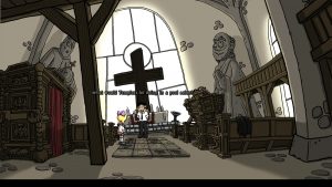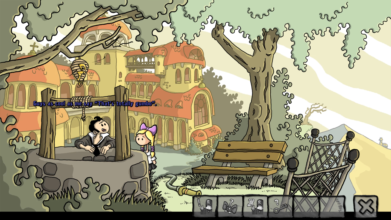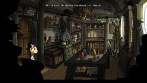 The game is overall worth playing, and has some really unique and interesting thoughts it prods in regards to the first game, but do be warned that it may come off as odd looking if you played the first game’s anniversary edition. The new art of that version makes some subtle changes that don’t mesh with the older designs this game works with, like Edna’s hair color. It might throw you for a loop briefly. Otherwise, the game looks solid, a bridging step in Michaelis’ art style he’d smooth out come the Deponia series. It’s heads above the sketchy look of the original version of the first game, but retains some of that sketchy quality at times, especially in terms of body proportions. It’s definitely a unique look compared to his later, more polished art.