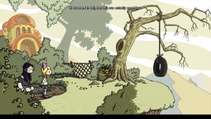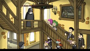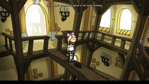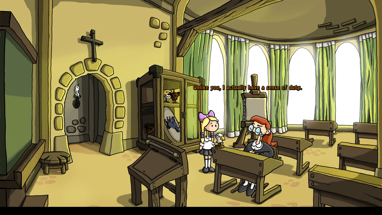 We do much better with the comedy in the puzzles. Harvey’s New Eyes cuts back on the first game’s verbosity in terms of interaction options, and it gets rid of the central area exploration until the final act, which is mostly stripped down. Instead, we get the more traditional Daedalic stage by stage structure, where we get put in new areas or situations and have to figure out how to deal with a given obstacle to continue, and it works really well here. The key to this is that every new area after the convent has Lili having to deal with a mental block set by a hypnotic Harvey, creating puzzles that require her to manipulate the real world to allow actions in her subconscious.
