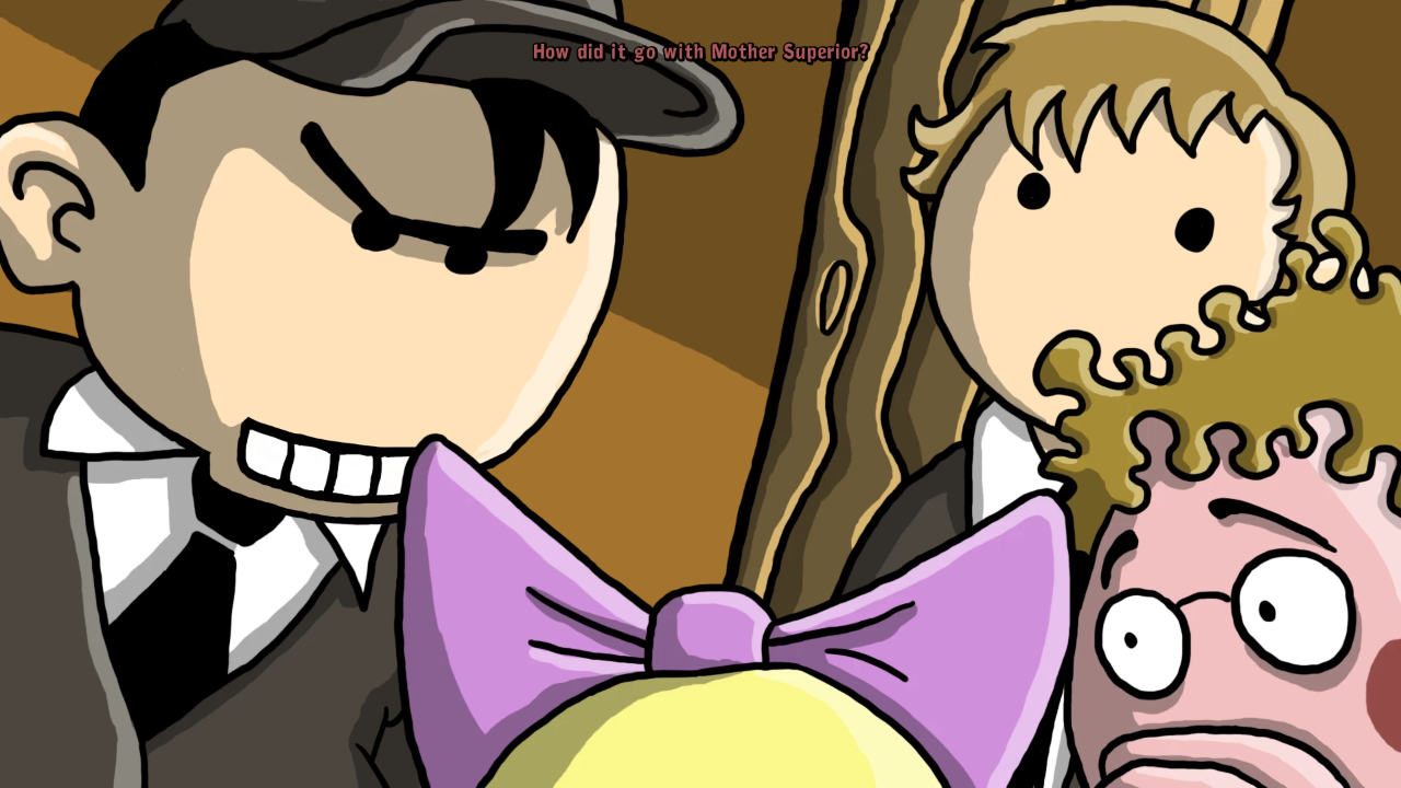 The game sets the stage for what’s coming very quickly, hitting hard with Michaelis himself singing a song about trying and failing to help hurt children over a long credit sequence following a thread connected to a ragged Harvey. From there, we get introduced to new lead character Lili, described by the overly enthusiastic and clearly untrustworthy narrator as a good girl who does whatever she’s told. We also quickly learn she gets interrupted whenever she tries to talk, and she’s also friends with Edna, who’s living at her convent.