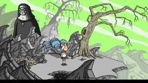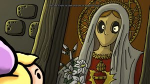 The usual adventure game happenings begin to occur as we learn that Dr. Marcel is coming to advise on dealing with the convent children and Edna starts freaking out…but things are off. Very off. Something seems to be wrong with Lili and how we’re even perceiving the story itself, which really starts to become apparent when the wacky kid characters end up dying in ways both comical and…not. Lili doesn’t seem to even register it either, their remains painted over by weird potato head looking “gnomes” and the game’s narrator never addressing what’s clearly happening to boot. When Marcel introduces a Harvey doll with modified eyes that hypnotizes people, things only get more surreal as Lili has to navigate bizarre dreamscapes and deal with the mental block Harveys to regain control of her own actions in order to leave and find Edna, who’s gone into hiding.