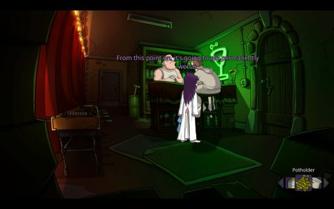 The remake version redraws everything, giving widescreen assets and moody lighting and shadows for the backgrounds and characters. The designs of the characters remain mostly faithful, but the details are touched up in the sketchier spots. The one significant change is that Edna’s original angry looking default pose has been switched with a more oblivious expression that better fits her actual character. Music does its job, and we have the usual iffy but expressive English dub we expect from Daedalic, though with no vocal theme from Michaelis this go around.