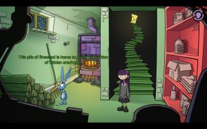 There’s also some unique flashback scenes called “tempomorphing” scenes where Edna explores a moment in her memories with Harvey’s help. The gimmick is you get direct control of both a child Edna and Harvey, each having actions they can do to help solve puzzles and learn new information. They work more as a storytelling hook than a solid puzzle mechanic, though. The one interesting shake up is from a memory about a time in class where only Harvey can move around freely, with the clever solution being finding things to distract Edna so she can be put in a closet where they can work together on something. It’s about as unique as these sequences get, which is odd with how much focus is put on them as a unique mechanic.