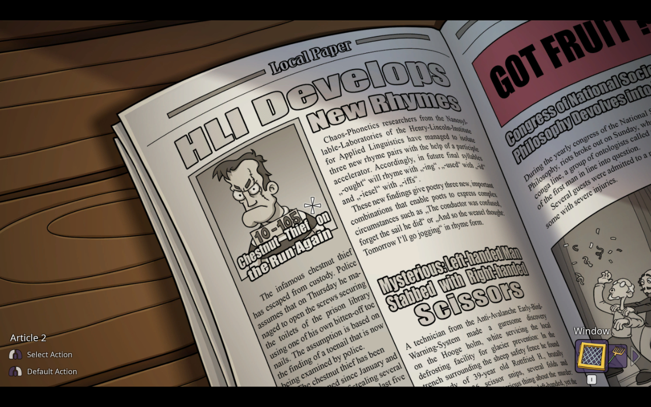 Puzzle design is also quite solid for a Daedalic title. There’s generally good pacing and puzzle grouping most of the time, and the story is paced into proper chunks that gets rid of unnecessary items. That said, there are points where it starts to drag due to having to navigate the asylum. It’s a pretty big layout with a lot of doors and floors to keep track of, and it starts to get really tedious once Marcel arrives with his extra men. Guards get placed in awkward spots, requiring Edna to either have to vandalize a car or mess with a gumball machine in order to move around the lobby area, a central point you need to visit to move through some important spots. When you don’t know exactly where you need to go next, it gets exhausting. Thank goodness the last two areas are more compact.