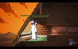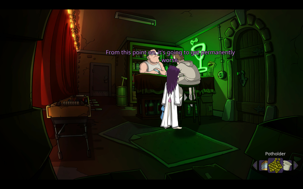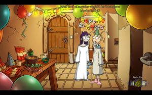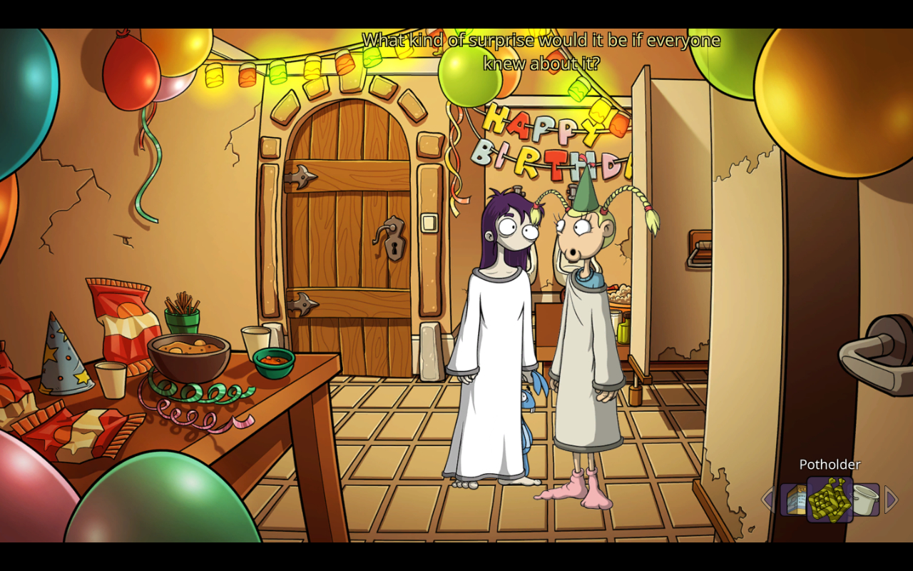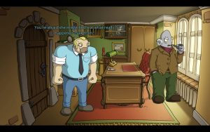 There’s two versions of the game out there now – the original and a 10th anniversary edition. The original really shows its age with a lack of widescreen support, and that’s not even getting into the rough doodles used to represent the characters. You can tell this was early in Michaelis’ career, the exaggerated and goofy eyes and mouths common in the later Deponia art is present but extremely crude. One need only look at Edna’s barely defined bare feet in her sprite to see the lack of polish.