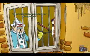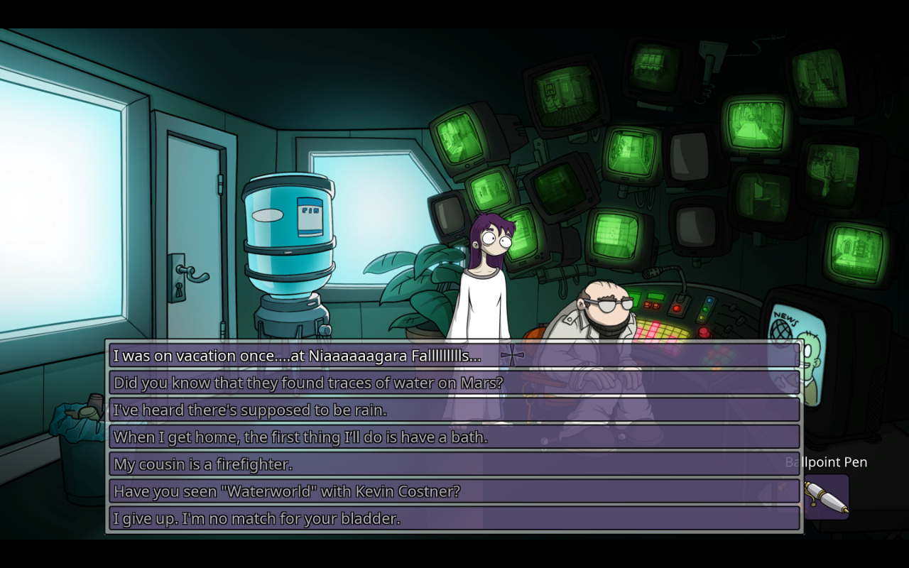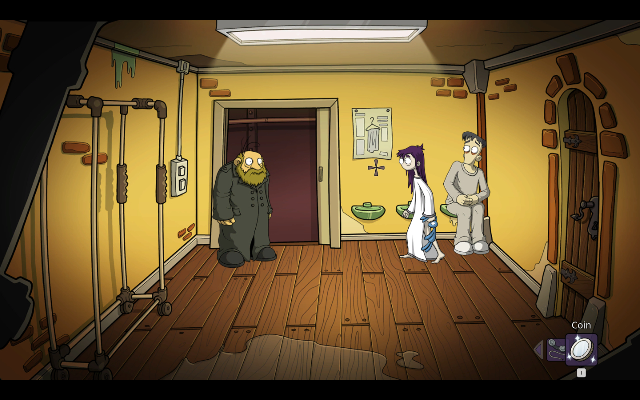 It helps there’s a ton of just flat out hilarious bits, most of them completely optional in surprisingly long dialog trees. A major stand out is definitely the guard in the camera monitor room who really has to pee, and you can probably piece together the comedy that ensues (though you may not expect a reference to Kevin Costner’s Waterworld). The game isn’t terribly long, but the open ended nature of exploring the asylum and the mess of things and people to interact with really help sell scope in the adventure.