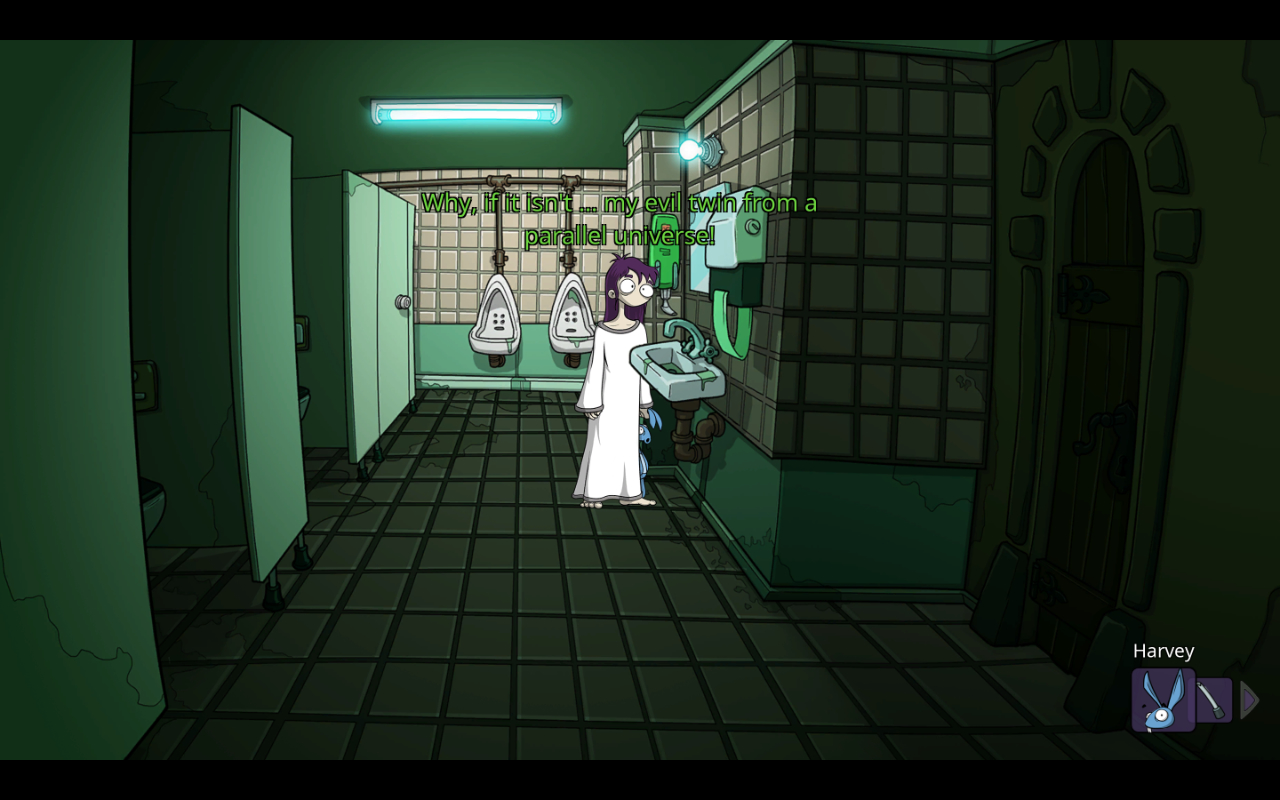 Something interesting about this game is that we don’t have the usual stripped down Daedalic design. Instead of simply having an inventory and streamlined click interactions, we get an old school “verb” interaction system. Edna has a variety of actions and ways to interact with things, and Harvey brings an even larger layer to it, as he can sort of change the property of an item being used by making him use it. There’s an absurd number of actions you can take – which is encouraged by the even more absurd number of unique lines for trying something. That definitely helps sell just how large the game feels, and thankfully doesn’t cause puzzles to drag often since most have pretty sensible solutions, or reward you with tons more jokes for experimenting.