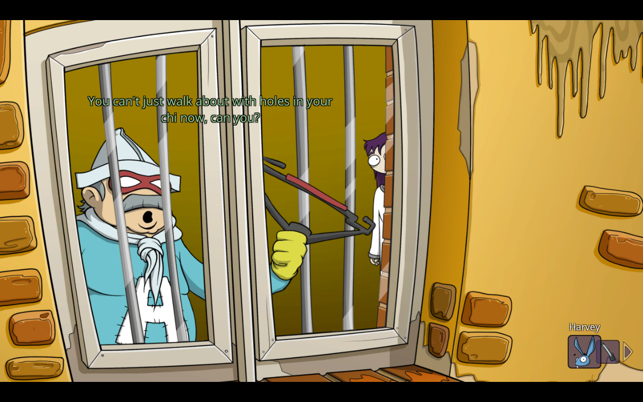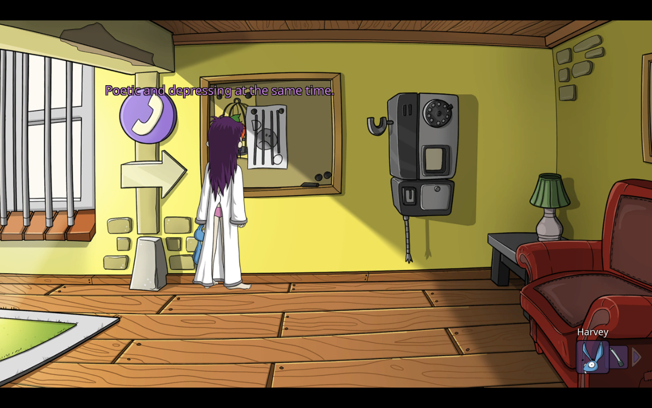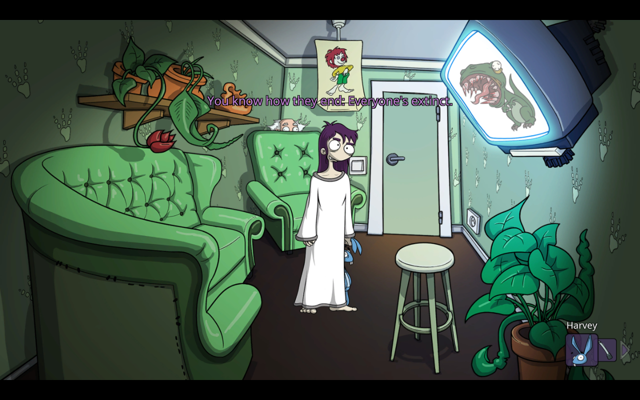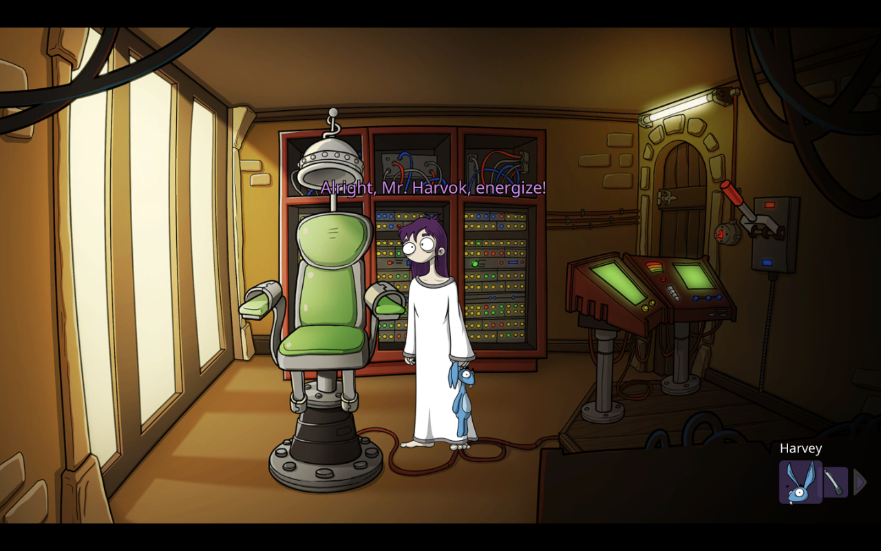 The story follows a girl named Edna Konrad, being kept in an asylum for reasons unclear to her. Thanks to her stuffed rabbit that she imagines talks to her, the titular Harvey, she does manage to understand that whatever led her here has something to do with the corrupt Dr. Horatio Marcel in charge of the place. After a trip to his office, she realizes her situation has something to do with the death of Dr. Marcel’s toad of a son and her father taking the fall for that. The two become motivated to figure out the truth, escape, and bring Marcel to justice, though that first requires doing various ridiculous point and click puzzles around the asylum’s eccentric patients.