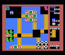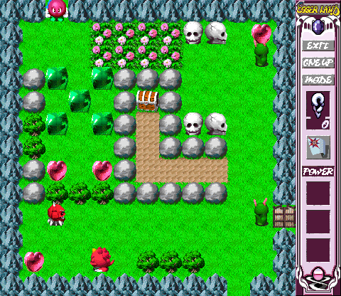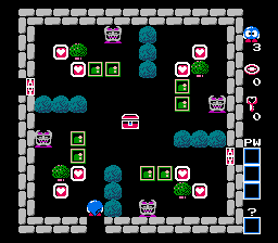 The Eggerland titles are those kinds of games where everything revolves around one very basic, constant concept. Each puzzle begins with Lolo inside of a small room that invariably fits neatly onto one single screen. Regardless of what exactly it was that got him there to begin with, Lolo needs to get out of whatever room he happens to be in at the time, and the only way to do that is to nab the contents of a treasure chest that's located in there with him. But to do that he has to open it first, and the only way that's gonna happen is if he grabs a bunch of tiles called Heart Framers (Diamond Framers in Eggerland Mystery) that are scattered throughout the room. But here's where it gets tricky: Lolo's not in there alone. Various monsters populate these rooms, too, and if he crosses paths with one then he's got to start the room over again - 'til he runs out of lives, at least. Luckily, sometimes grabbing a Heart Framer will grant Lolo a couple magic shots, with which he can temporarily encase said beasts in giant eggs. And the rooms themselves are veritable mazes, where a misstep can get you stuck and force you to restart.