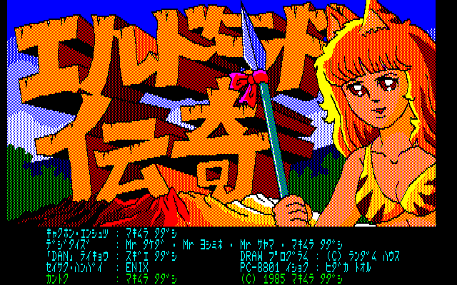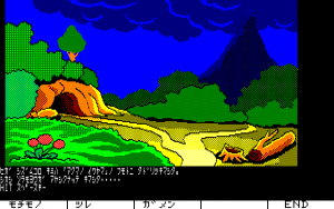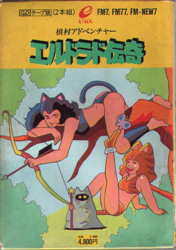 Many early text adventures sent you to exotic locations, to explore the pyramids or Egypt or South America and uncover the secrets of lost civilizations. El Dorado Denki (“El Dorado Romance”), published by Enix, follows along that line, also adding in a healthy dose of naked cat girls. The game was designed by manga artist Tadashi Makimura, also known as Doronpa, as part of a programming contest held by Enix. He had also created Mari-chan’s Kiki Ippatsu, a somewhat more openly lascivious title, a couple years before.