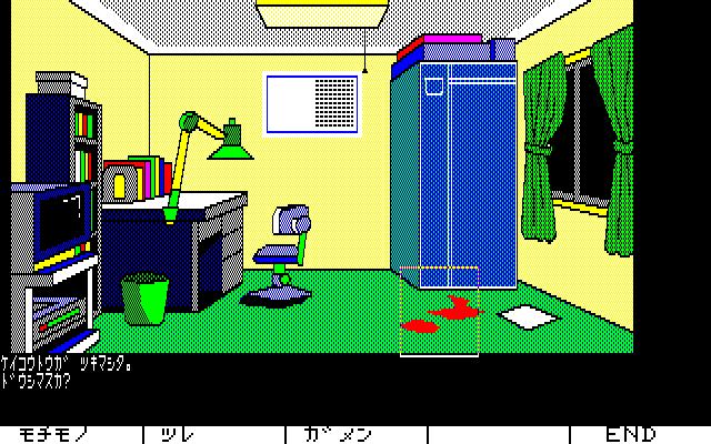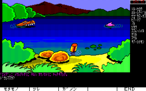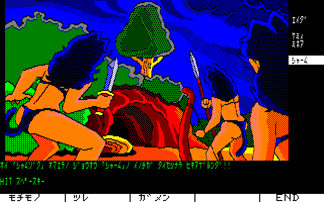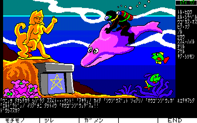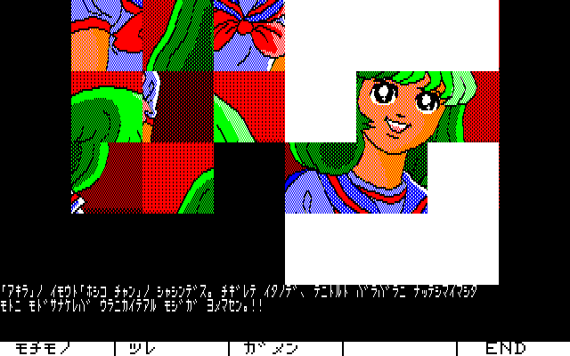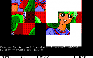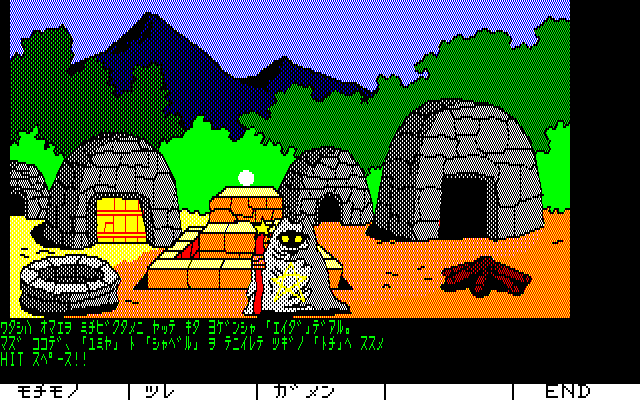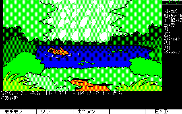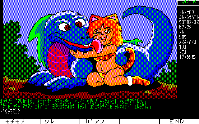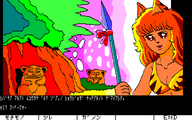 The story pointlessly starts with a frame story regarding your friend Akira, who calls you up in the middle of the night and beckons you to come over. You find him dead in his closet, and upon piecing together bits of clues in a computer program he was working on, discover that his sister has been kidnapped, causing you to follow the trail to El Dorado in South America. The indigineous creatures here are “Amazonekos” (“Amazon cats”, roughly); some tribes are friendly, some aren’t. The ultimate goal is to find a piece of a golden statue as well as stars tattooed on the bodies of the various ladies. Said tattoo stars are also always located on a place that requires them to doff their clothes. Despite its pervertedness, it’s not nearly as rapey as it sounds, for the most part – you do spy on a few who are tied up, although one is already naked and about to be sacrified, and another you tie up because she is trying to kill you. The nudity is abundant, but it’s largely handled in a playful manner, and it’s not really an eroge, since the goal isn’t really to bed them either. Overall, the visuals are quite excellent for a PC game from 1985, with brightly color backgrounds, cartoonish beasts and attractive ladies, though the art style alternates between realistic and super deformed.