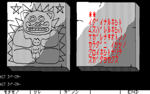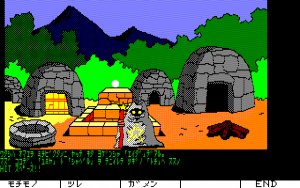 It’s not a terribly well designed game either. Most of the puzzles are standard – dig up stuff with shovels, shoot things with bows and arrows – although occasionally progress is impeded unless you ask one of your companions what you should be doing. There are also a few tile puzzles where you need to reassemble a picture, although these aren’t so much difficult as tedious. The aggravating part is that the game is distressingly linear, to the point where you’re usually contained between one or two screens. There is no proper save system, and instead the game gives passwords to let you resume progress, forcing you to restart the whole chapter if you’ve missed a vital item and gotten stuck. So although it falls victim to various early technological and design flaws, the premise and the cutesy characters are enough to distinguish itself, that it remains recognized amongst Japanese retro PC enthusiasts.