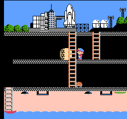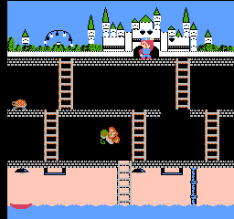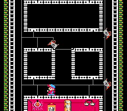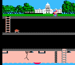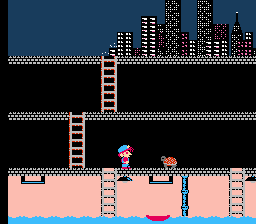 The tower levels are mostly the same, though the jumping arc feels a little off. The sewer maze sections have been simplified so you don’t need to worry about keys or building numbers, you just venture through them to get to the next stage. There aren’t quite as many tiers to the sewers, plus you can actually walk on the surface, though in order to actually access a building, you need to approach from beneath it. The surface area also has different backgrounds of various places in the United States, including New York City, San Francisco, and Niagara Falls. Also new are assorted power-up items, that can light up the entire sewer maze, destroy sewer walls, or increase your jumping power.