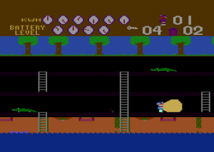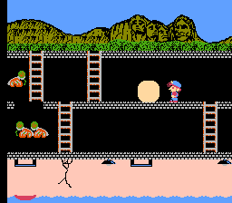Once you’ve lit up the entire tower, you need to escape through the basement and into the sewers. These stages scroll from left to right and are divided into several tiers. The biggest threat here are the crocodiles, though they’re pretty easy to jump over, as long as you don’t touch their jaws. Rather unusually, the crocodiles will occasionally lay eggs – if you get close enough, there’s a random chance it’ll hatch with an extra life, or something that will kill you. Your way is lit by a headlight on your helmet, which will reveal walls once you get close enough. If you come across a dead end, the only recourse is to backtrack, take a ladder to another floor, and see if you can find your way forward. The walls in this section are actually randomized, so you can’t memorize the wall spots even if you wanted to. In a few cases, you may even need to climb to the bottom level of the sewers, which is flooded with water. You can jump on a raft that floats back and forth, though if you miss a jump onto another ladder, you may find yourself knocked into the water. When you first enter the sewer, you’re given a key with a number on it, which corresponds to the location of your next job. The first few stages are straightforward, but after the second stage, you’re given a key with the number “4” on it, which means you need to bypass building #3 and head onto the next one. This cycle continues until you reach the end of the game or run out of lives. However, the initial release of the game has a bug later in the game that causes it to become unbeatable, so you’ll need a patched version if you actually want to finish it.