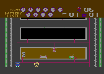 The game is divided into two different types of levels. The first part is a vertical tower, separated into several floors. The goal here is to run wire from one end to the other, connecting it to the floor and ceilings when necessary, which will then provide power to the room. You’re pestered by various vermin along the way, which can disconnect the wires if you’re in the process of connecting them. In the early levels, nasties like caterpillars and rats are minor nuisances, but your opponents quickly become more deadly, like the bats, that will pick you up and drop you at some random spot (potentially tossing you off the building) or the spiders, who create invisible webs to get tangled in and can kill you contact. Some can be killed by stomping on them, some can be kicked, while others can only be destroyed if they come into contact with a live wire. Thankfully, compared to the protagonist from Spelunker, the hero of Electrician has quite a bit of fortitude, and can actually survive a fall of a story or two, though any more will kill him. If you light up a room with a television set, it will come to life, leap through the floor, and attempt to walk of the screen. If you manage to catch it, you’ll get an extra life.