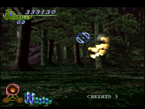 The basic workings of the average light gun shooter remain unchanged: you maneuver a reticule across the screen, shooting at enemies before they get the drop on you (signalled by shrinking boxes around an enemy ready to attack you) and at special items before the opportunity passes. Any modifications the game makes to this basic framework are minor. For example, in lieu of weapons you need to reload or whose ammunition can be exhausted, you instead get three weapons you cycle through depending on the circumstances: a fire-based shotgun, a water-based spread gun, and more limited lightning-based spread gun.