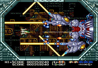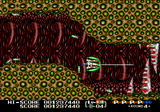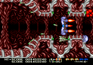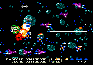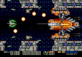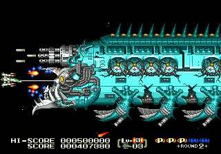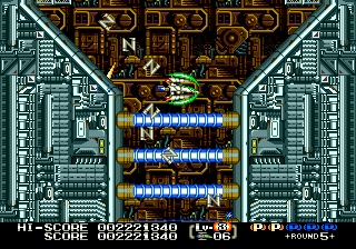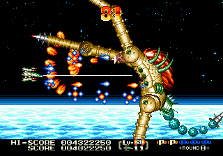 The highlight of the game is its level design, as many of them are unique and features omnidirectional scrolling. These winding levels add a lot to the overall feel of the game, especially since they put your skills with the various weapons to the test. The first stage features the launch of your fighter as it flies through the first level fleet of enemies, descends into the atmosphere of a plant while fending off a barrage of missiles, before finally reaching the Mars-like surface and facing off against the boss.