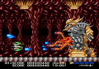 The graphics during all of this are mighty impressive. At first glance it doesn’t look too different from the standard 16-bit shooter, although even on that level of judgment it’s well done, featuring huge and colorful sprites. There are some rotation effects – rare on the Genesis – as well as bits of three dimensional designs, like the first bosses’ drones, which moves in and out of the foreground. The larger bosses consist of many smaller sprites stuck together, for the sake of smoother animation. Granted, some of their designs are reminiscent of other shooters – some of the mechanical designs and bosses may have been taken from Gradius, a few creepy biological monsters are similar to R-Type and its lesser known little brother X-Multiply, and the practice of sticking human faces and features on metal is taken from Masaya’s Wings of War / Gynoug (otherwise known as the predecessor to Cho Aniki). And yet in spite of being clearly inspired by all of these games, it very clearly feels like its own game, owing to not only the talents of both the artists and designers. It’s hard to say that Eliminate Down is particularly innovative, but it’s so damn well put together that it hardly matters.