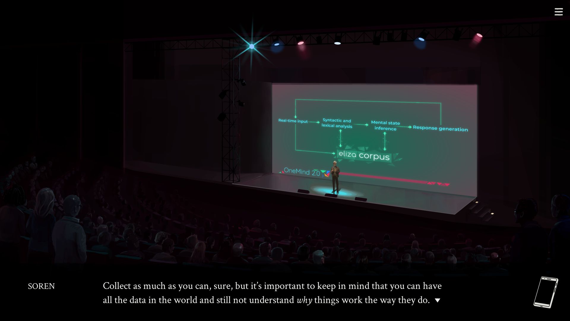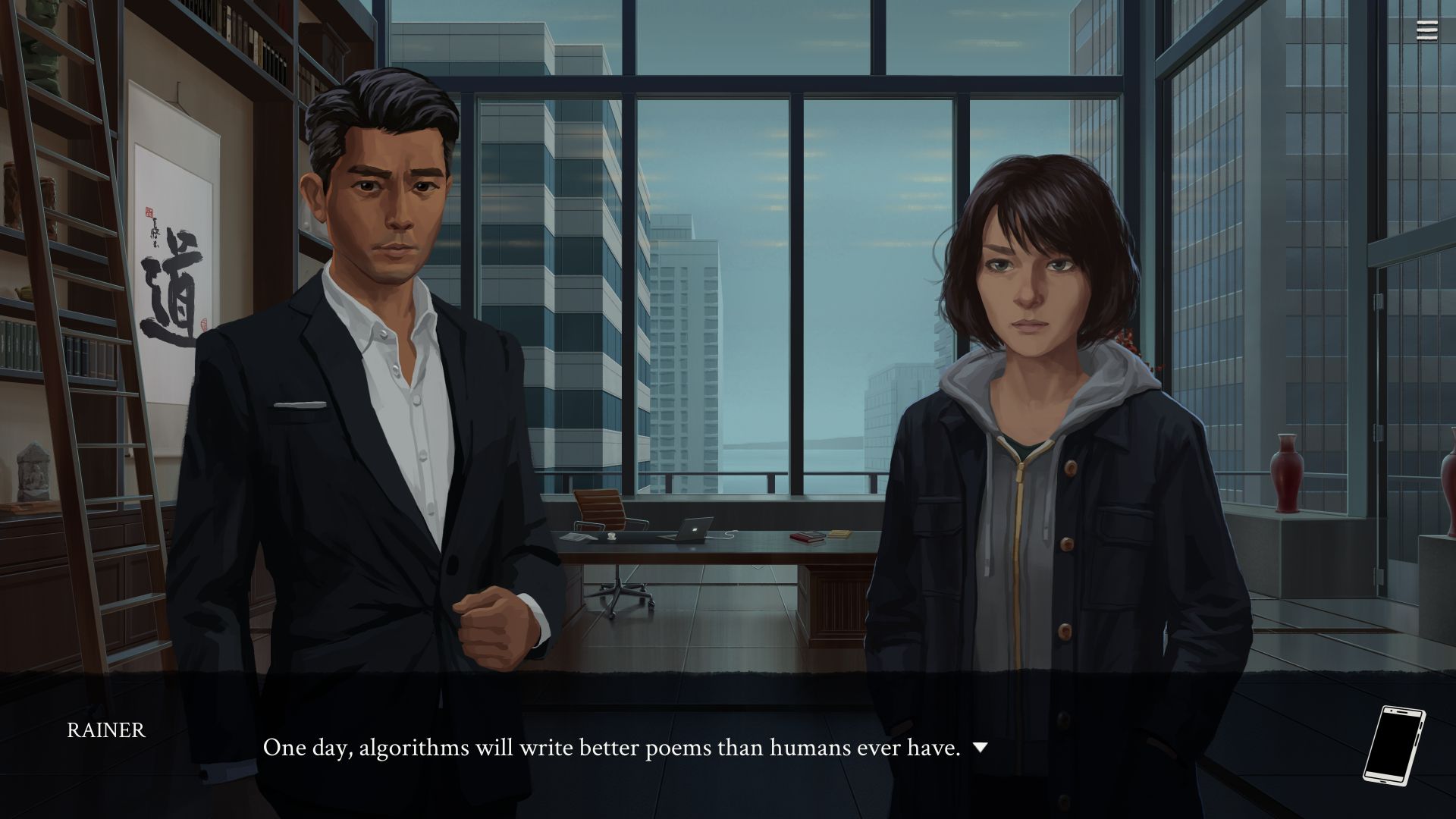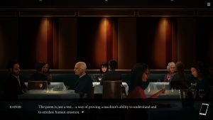 Aesthetically, Eliza is a game of clean, airbrushed visuals and somber colors. The few colorful scenes it has stand out, since for the most part the game has the aura of a slow drama or even one of Black Mirror’s less aggressive episodes. Which makes sense, since it’s set in ever-rainy Seattle and its gentrified environments – offices, convention halls, cozy cafes. Everything feels smooth and clinical, which is accentuated by Burns’ music, with electric piano-ish synths quietly making their way into the background of important scenes.