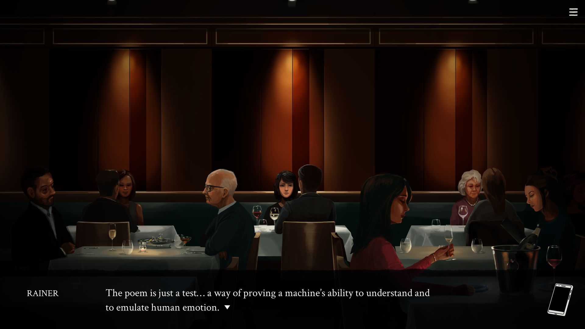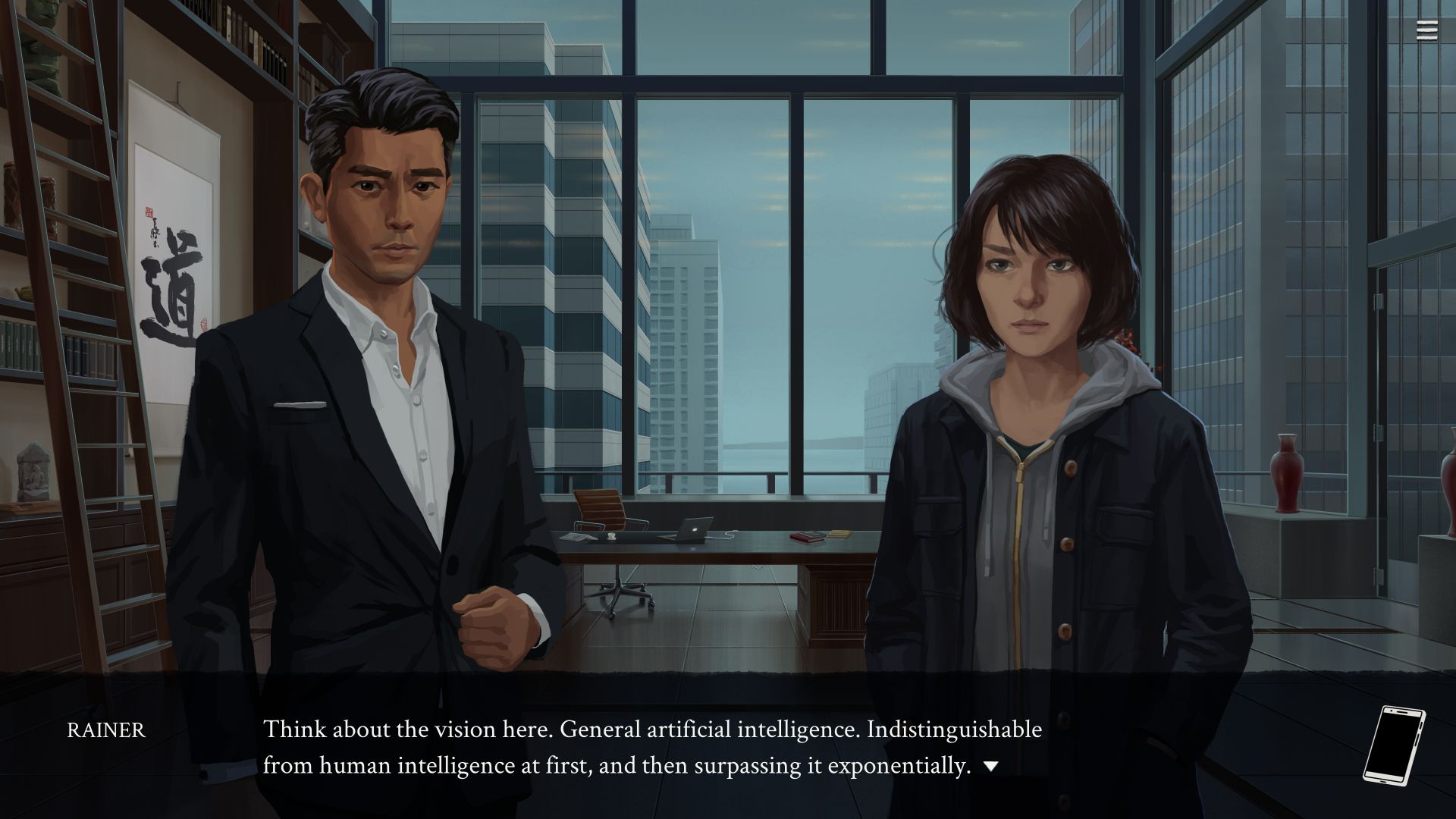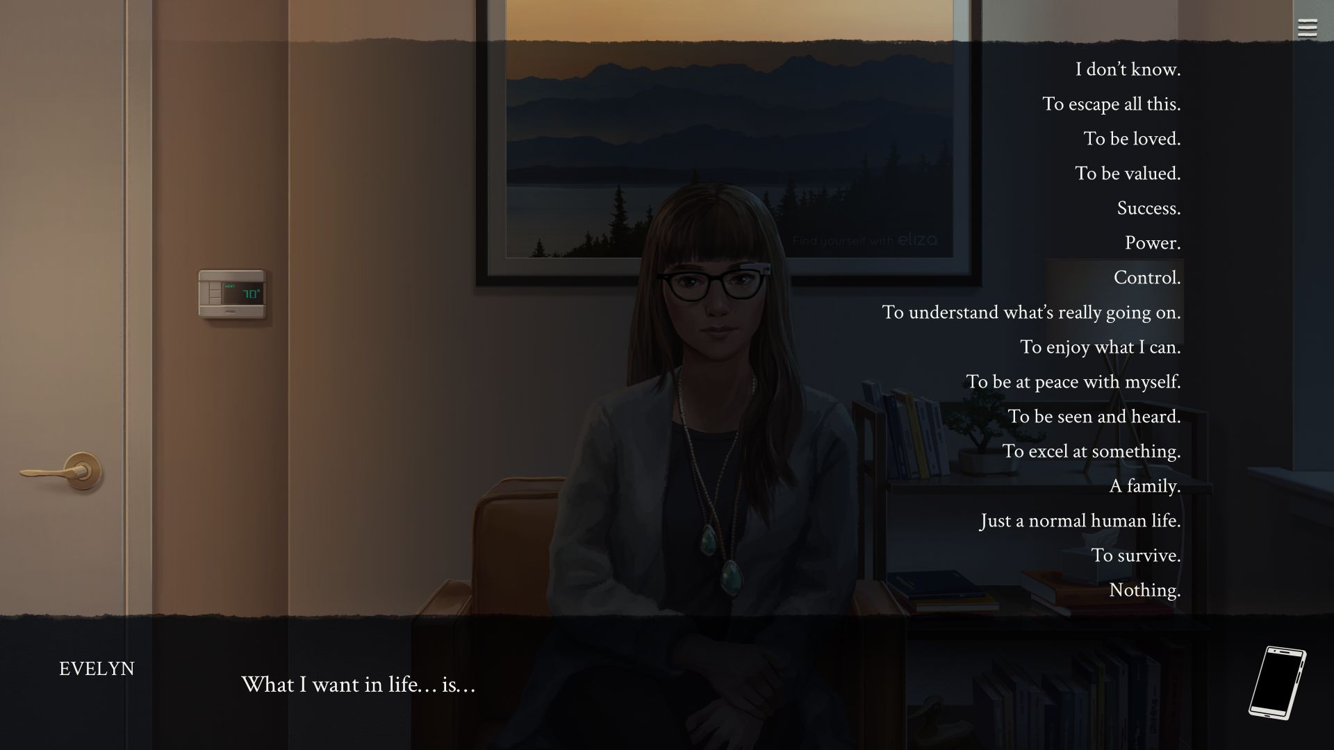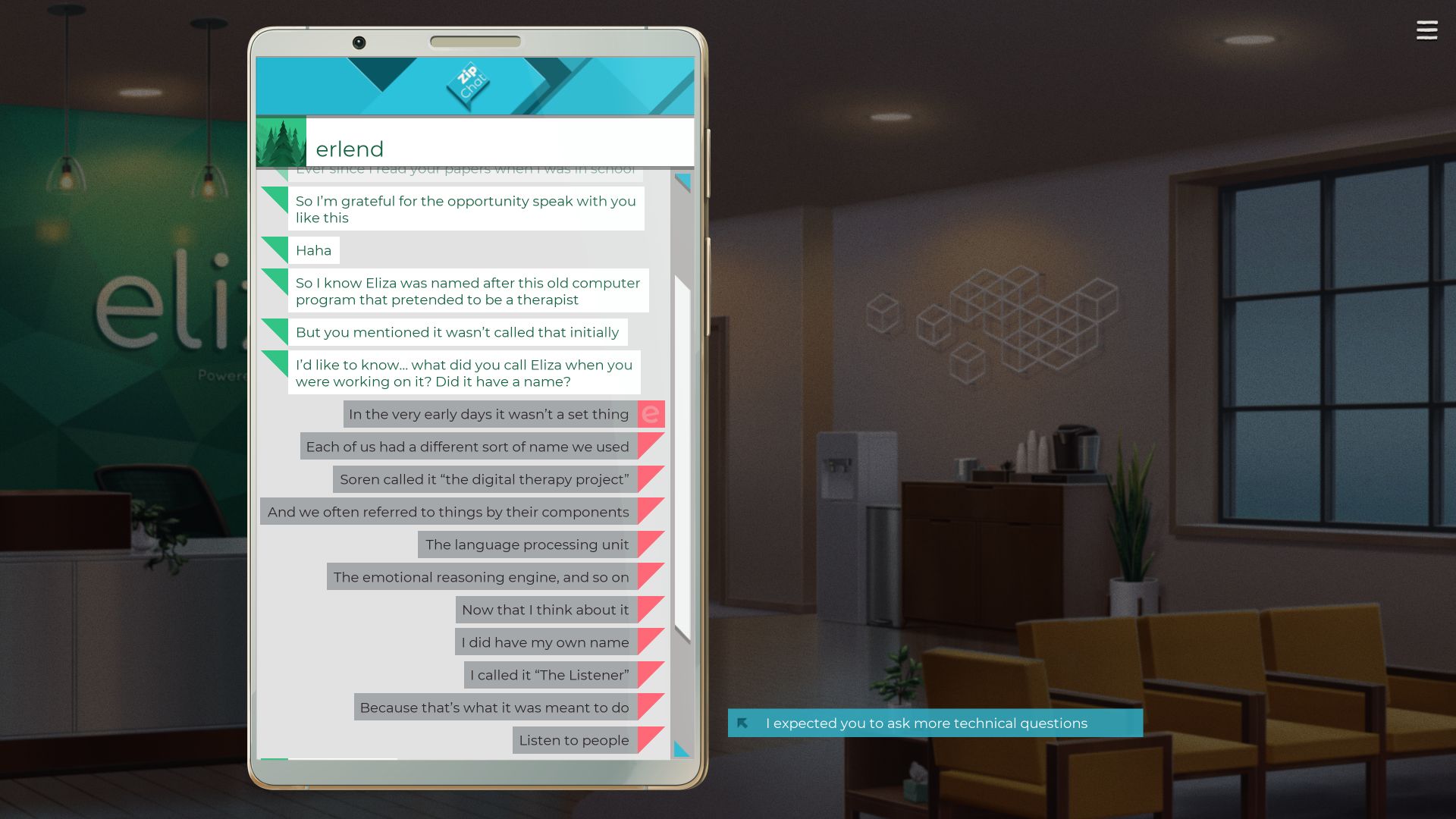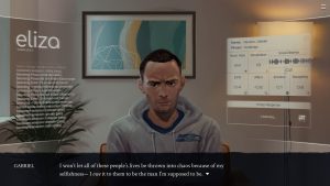 If you decide Eliza can be improved, you can join forces with Rainer, the CEO of Skandha, Eliza’s owner company. He wants to transform it into a full AI, as well as to sell it to other businesses in a movement to make Eliza indissociable from society, triggering an irreversible change similar to the Industrial and Digital Revolutions. It’s Eliza’s darkest ending, but it’s not a bad one, since Evelyn still ends up making substantial improvements to the AI’s service, making it less unhealthy. In fact, there are no good or bad endings: they all feel like different solutions to the same problem, instead.