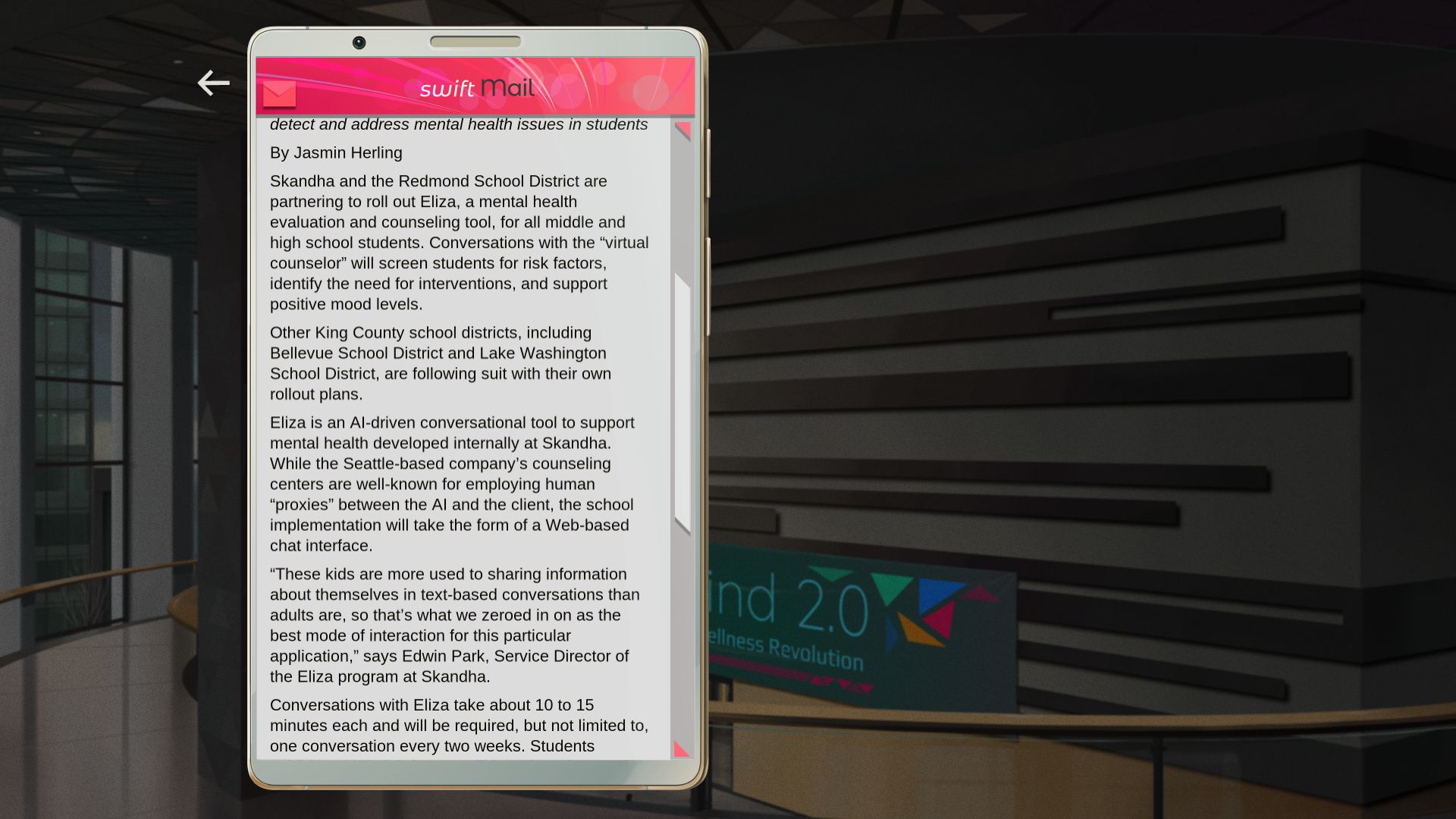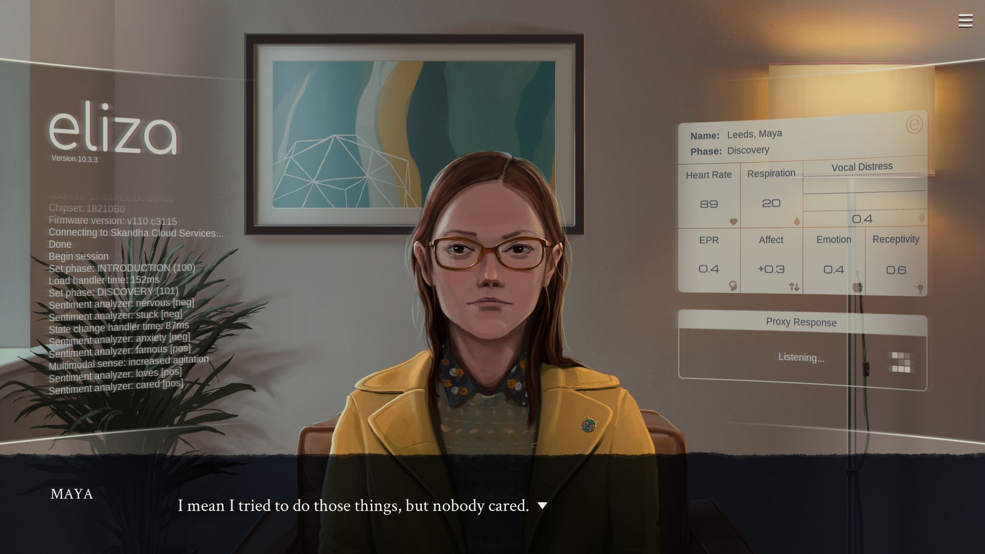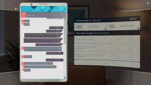 You play as Evelyn, who decides to sign on to work for Eliza, an automated counseling service that uses a homonymous AI. Her job is to read Eliza’s responses in face-to-face sessions – to serve as a “proxy”, a human avatar that allows clients to relate more to the AI and its advice. The service is a sort of Uber of therapy: clients make an appointment and proxies are assigned to them, and like Uber drivers, proxies have little agency in their job. Their ulterior task is to keep a neutral tone and be faithful to the script given by Eliza, which is displayed on a visual device that also shows a variety of biometrics.