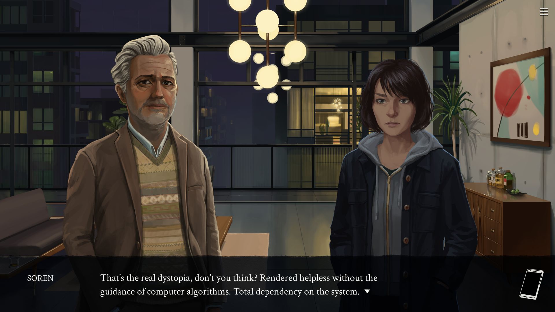 In general, Eliza is very well-written, with characters flawed and strong in equal measure, and a story that doesn’t deliver itself to you chewed and digested. Its only flaw is that Evelyn seems to suffer from Commander Shepard syndrome, as everyone praises her programming skills and inventiveness, yet nothing in the game shows that in action. The game is also very short – in the afternoon it takes to finish it, you’ll likely be left wanting more. Especially since it discusses a lot of interesting topics that games rarely explore, such as socioeconomic alienation, the predatory nature of work culture, big data’s growing role in society, and much more.
