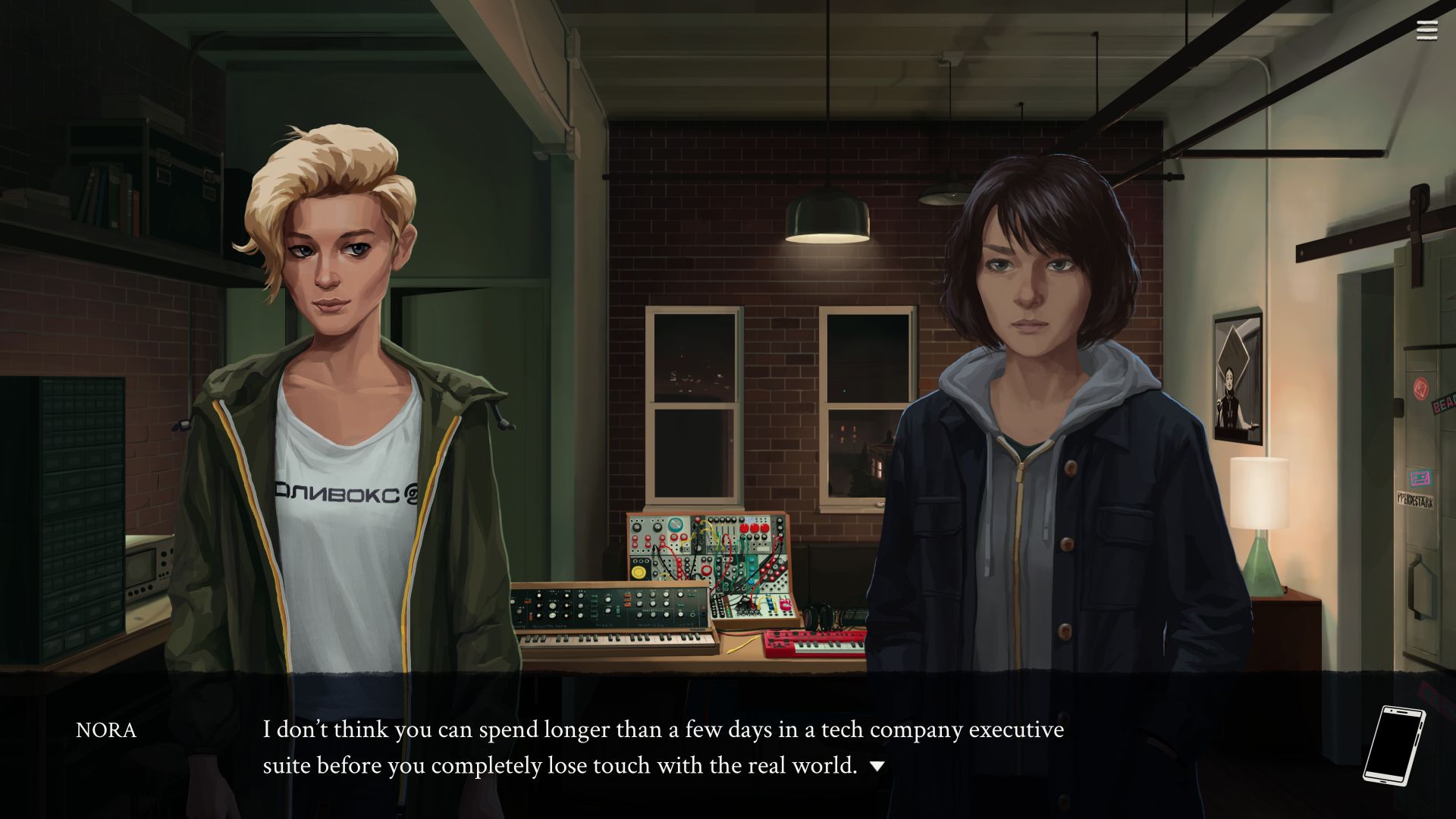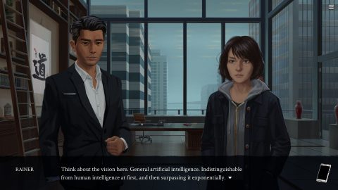 What’s nice about this final choice is that each character has their own philosophy and point of view, which are mirrored by the opportunities they offer. For instance, if you decide Eliza needs a less commercial and monopolistic alternative, you can join forces with Nora, also an old friend and a former member of the Eliza team. She firmly believes in non-corporate ways of making a living, and she invites you to develop an open-source clone of Eliza, among other independent endeavors.