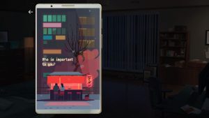 In the end, you’ll prescribe her medication for her shoulder pain and that’s it – you can’t even break script, or you’ll get fired. Something clearly needs to change, and luckily it turns out that Evelyn didn’t choose to work for Eliza out of opportunity or chance. There’s some mystery at first regarding some familiarity of hers with her surroundings, but it doesn’t take long before the game spells it out: Evelyn was one of Eliza’s creators, a part of its original developing team. She quit it after the death of one of her co-workers – and best friends -, who died from overwork during one of many crunching sessions, in a push to expand Eliza from a simple auxiliary to therapy to a Uber-like means in itself.