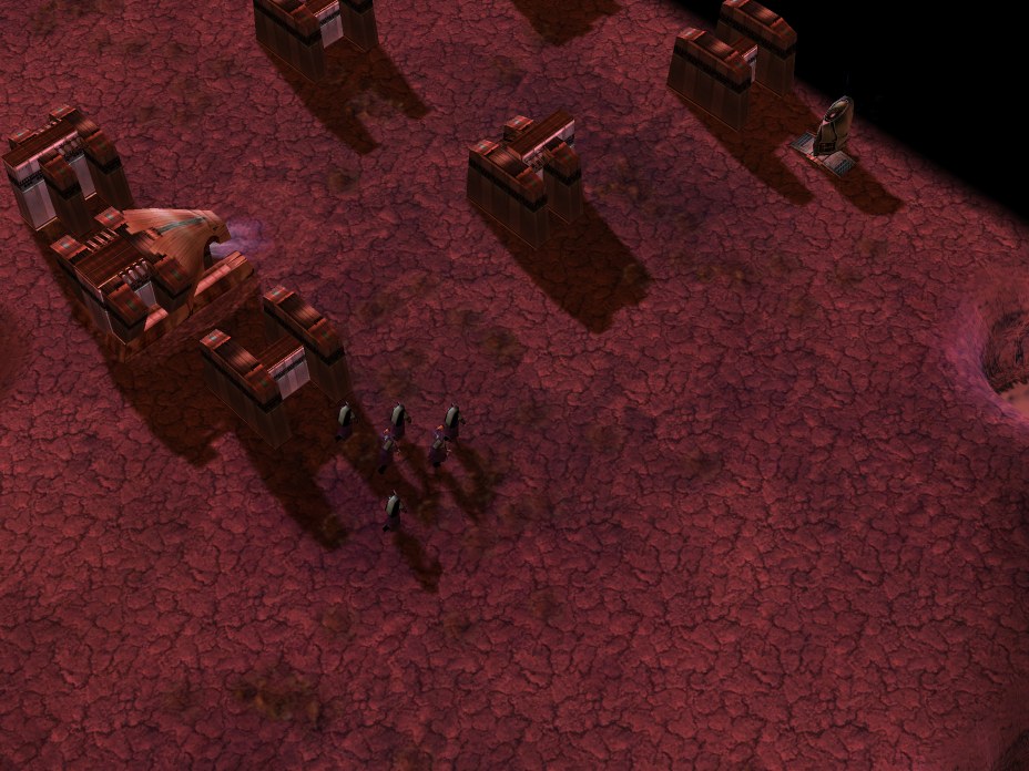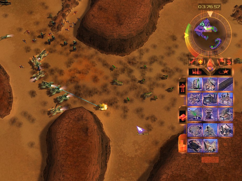 The Harkonnen have no such ability. Instead, they have the toughest units. Even if damaged, they will no slow down. On the other hand, Harkonnen units cannot be repaired and never regenerate, unless they reach maximum veterancy. In tune with their theme of being evil and generally nasty, the Harkonnen barracks trains flamethrower infantry in addition to riflemen and rocket soldiers. Courtesy of the arms factory are a giant piloted buzz saw that slices through Spice and human bodies as well as the boring but practical assault tank and rocket launcher. New are the flame tank, which burns infantry swiftly and painfully, and the Inkvine catapult. Based on a throwaway line from the novels, it fires barrels of Inkvine, a corrosive substance. The Devastator also makes a return. Now a walker, it can fire at air and ground targets, which makes its role more similar to that of the Command & Conquer Mammoth and Apocalypse tanks. Unfortunately, the Devastator went from being painfully slow to being unfathomably slow. Unless transported by a carryall, it serves best as a mobile base defense. Also available is a gunship that, while slower than its Atreides sibling, is heavily armored. Lastly, the Death Hand missile makes a return. Once the ultimate destroyer of bases, it is now a moderately exciting glorified radioactive firecracker.