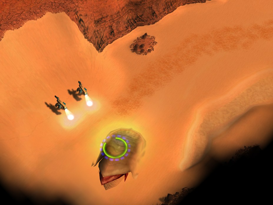 In addition to the campaign structure, the units of the various houses were overhauled. The only units that all houses share are the construction vehicle, the Spice harvester, the engineers, the scout, and the carryall. The Atreides have access to basic infantry, mortar troopers, and snipers. Their arms factory produces the sand bike, a scout unit, the versatile Mongoose, a walker that can attack both ground and air targets, and the slow but powerful and long-ranged Minotaurus. Also available as a stealthed APC and a repair vehicle. Their air units are the assault ornithopter, which is especially useful against the AI, and an air defense drone, an unmanned craft be used against other air targets. The Atreides high-end unit is once more the sonic tank, which, while very powerful, still has the unfortunate habit of disintegrating its friends as quickly as its foes. Provided by the Atreides palace is the Hawk Strike support power. A unit hit by the Hawk Strike flees in terror, which is only a minor inconvenience – until a fleeing unit reaches the end of the map and disappears forever. The Atreides also have a special ability: an Atreides veteran soldier can be send back into their barracks and act as an instructor. Thereafter, the barracks will produce veteran units.