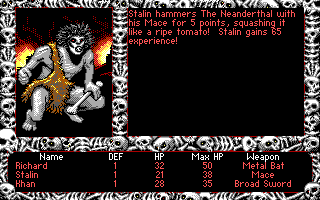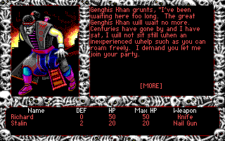 All characters have their own set of abilities too. Ghengis Khan and Hamlet, for example, are great at fighting. Other characters have skills that are pretty much worthless. Stalin has a high skill level in bureaucracy, which is pretty funny, but is never really useful. Some characters even have bad skills. Hitler will sometimes get into fights with your other party members, so while he comes with great equipment, he’s pretty much dead weight. Choosing your party members wisely is important, as you only get three party slots and one has to be occupied with Richard and later on, Alan, and some allies are going to be clearly better than others.
